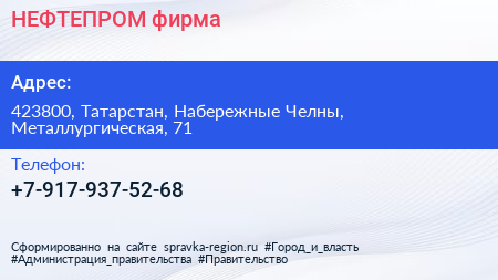 НЕФТЕПРОМ, фирма по адресу 423800, Татарстан, Набережные Челны, Металлургическая, 71 в дальнейшем Организация, размещена в следующих категориях: