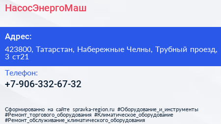 НасосЭнергоМаш по адресу 423800, Татарстан, Набережные Челны, Трубный проезд, 3 ст21 в дальнейшем Организация, размещена в следующих категориях: