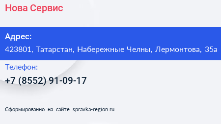 Нова-Сервис по адресу 423801, Татарстан, Набережные Челны, Лермонтова, 35а в дальнейшем Организация, размещена в следующих категориях:
