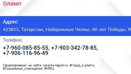 Олимп по адресу 423815, Татарстан, Набережные Челны, 40 лет Победы, 90 в дальнейшем Организация, размещена в следующих категориях: