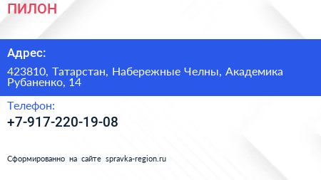 ПИЛОН по адресу 423810, Татарстан, Набережные Челны, Академика Рубаненко, 14 в дальнейшем Организация, размещена в следующих категориях: