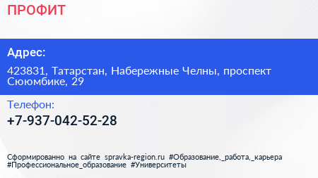 ПРОФИТ по адресу 423831, Татарстан, Набережные Челны, проспект Сююмбике, 29 в дальнейшем Организация, размещена в следующих категориях: