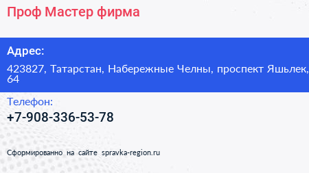 Проф-Мастер, фирма по адресу 423827, Татарстан, Набережные Челны, проспект Яшьлек, 64 в дальнейшем Организация, размещена в следующих категориях: