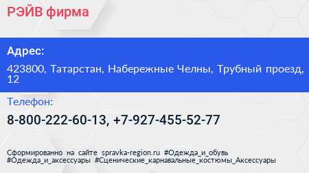 РЭЙВ, фирма по адресу 423800, Татарстан, Набережные Челны, Трубный проезд, 12 в дальнейшем Организация, размещена в следующих категориях: