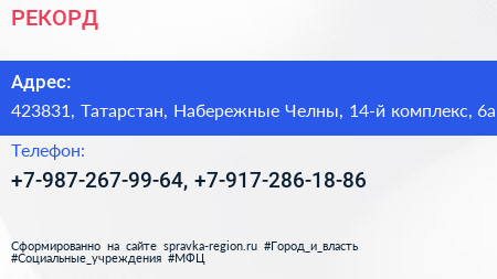 РЕКОРД по адресу 423831, Татарстан, Набережные Челны, 14-й комплекс, 6а в дальнейшем Организация, размещена в следующих категориях: