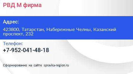 РВД-М, фирма по адресу 423800, Татарстан, Набережные Челны, Казанский проспект, 232 в дальнейшем Организация, размещена в следующих категориях: