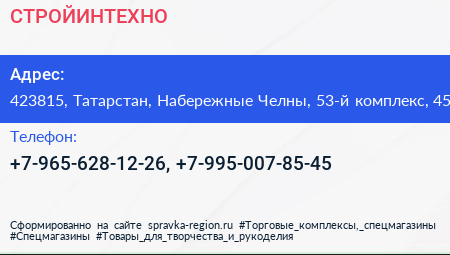 СТРОЙИНТЕХНО по адресу 423815, Татарстан, Набережные Челны, 53-й комплекс, 45 в дальнейшем Организация, размещена в следующих категориях: