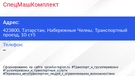 СпецМашКомплект по адресу 423800, Татарстан, Набережные Челны, Транспортный проезд, 10 ст5 в дальнейшем Организация, размещена в следующих категориях: