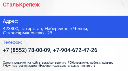 СтальКрепеж по адресу 423800, Татарстан, Набережные Челны, Старосармановская, 29 в дальнейшем Организация, размещена в следующих категориях: