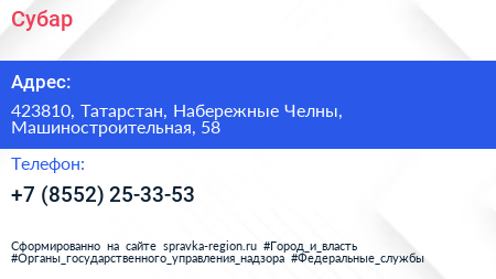 Субар по адресу 423810, Татарстан, Набережные Челны, Машиностроительная, 58 в дальнейшем Организация, размещена в следующих категориях: