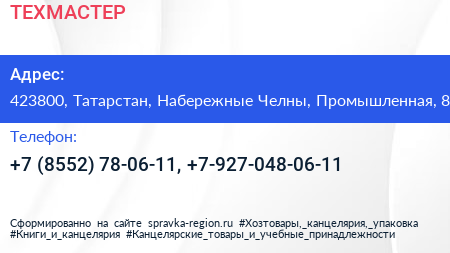 ТЕХМАСТЕР по адресу 423800, Татарстан, Набережные Челны, Промышленная, 8 в дальнейшем Организация, размещена в следующих категориях: