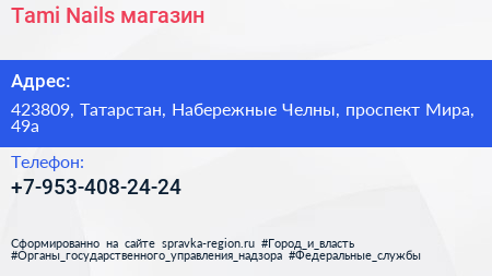Tami Nails, магазин по адресу 423809, Татарстан, Набережные Челны, проспект Мира, 49а в дальнейшем Организация, размещена в следующих категориях: