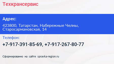 Техкрансервис по адресу 423800, Татарстан, Набережные Челны, Старосармановская, 14 в дальнейшем Организация, размещена в следующих категориях: