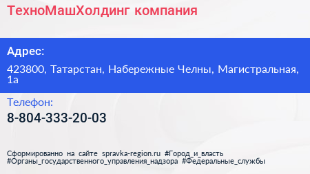 ТехноМашХолдинг, компания по адресу 423800, Татарстан, Набережные Челны, Магистральная, 1а в дальнейшем Организация, размещена в следующих категориях: