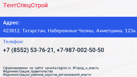 ТентСпецСтрой по адресу 423812, Татарстан, Набережные Челны, Ахметшина, 123а в дальнейшем Организация, размещена в следующих категориях: