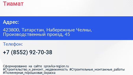 Тиамат по адресу 423800, Татарстан, Набережные Челны, Производственный проезд, 45 в дальнейшем Организация, размещена в следующих категориях: