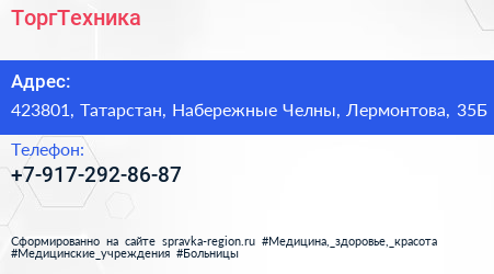 ТоргТехника по адресу 423801, Татарстан, Набережные Челны, Лермонтова, 35Б в дальнейшем Организация, размещена в следующих категориях:
