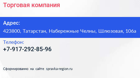 Торговая компания по адресу 423800, Татарстан, Набережные Челны, Шлюзовая, 106а в дальнейшем Организация, размещена в следующих категориях: