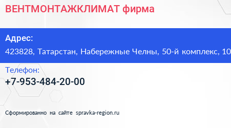 ВЕНТМОНТАЖКЛИМАТ, фирма по адресу 423828, Татарстан, Набережные Челны, 50-й комплекс, 10 в дальнейшем Организация, размещена в следующих категориях: