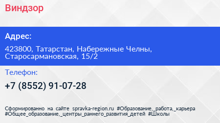 Виндзор по адресу 423800, Татарстан, Набережные Челны, Старосармановская, 15/2 в дальнейшем Организация, размещена в следующих категориях: