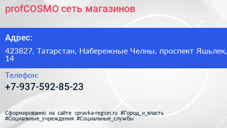 profCOSMO, сеть магазинов по адресу 423827, Татарстан, Набережные Челны, проспект Яшьлек, 14 в дальнейшем Организация, размещена в следующих категориях: