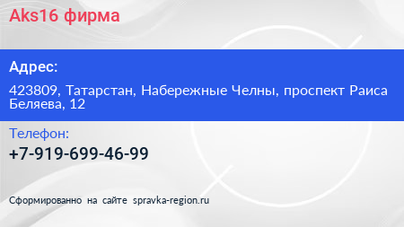Aks16, фирма по адресу 423809, Татарстан, Набережные Челны, проспект Раиса Беляева, 12 в дальнейшем Организация, размещена в следующих категориях: