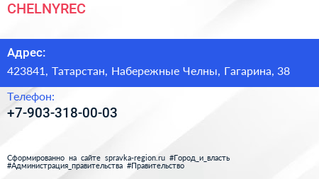 CHELNYREC по адресу 423841, Татарстан, Набережные Челны, Гагарина, 38 в дальнейшем Организация, размещена в следующих категориях: