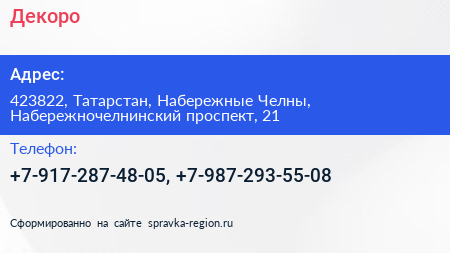 Декоро по адресу 423822, Татарстан, Набережные Челны, Набережночелнинский проспект, 21 в дальнейшем Организация, размещена в следующих категориях: