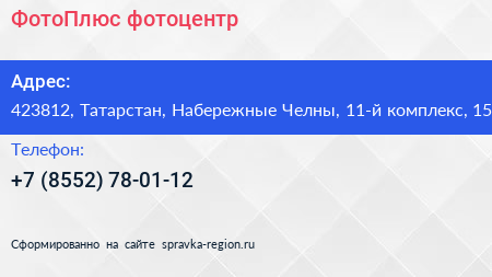 ФотоПлюс, фотоцентр по адресу 423812, Татарстан, Набережные Челны, 11-й комплекс, 15 в дальнейшем Организация, размещена в следующих категориях: