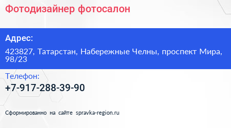 Фотодизайнер, фотосалон по адресу 423827, Татарстан, Набережные Челны, проспект Мира, 98/23 в дальнейшем Организация, размещена в следующих категориях: