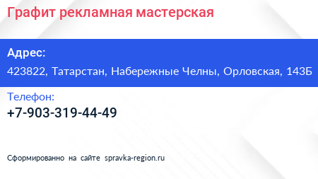 Графит, рекламная мастерская по адресу 423822, Татарстан, Набережные Челны, Орловская, 143Б в дальнейшем Организация, размещена в следующих категориях: