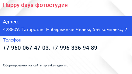 Happy days, фотостудия по адресу 423809, Татарстан, Набережные Челны, 5-й комплекс, 2 в дальнейшем Организация, размещена в следующих категориях: