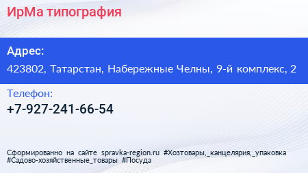 ИрМа, типография по адресу 423802, Татарстан, Набережные Челны, 9-й комплекс, 2 в дальнейшем Организация, размещена в следующих категориях: