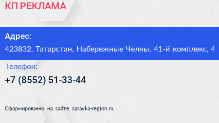 КП РЕКЛАМА по адресу 423832, Татарстан, Набережные Челны, 41-й комплекс, 4 в дальнейшем Организация, размещена в следующих категориях: