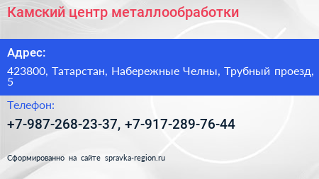 Камский центр металлообработки по адресу 423800, Татарстан, Набережные Челны, Трубный проезд, 5 в дальнейшем Организация, размещена в следующих категориях:
