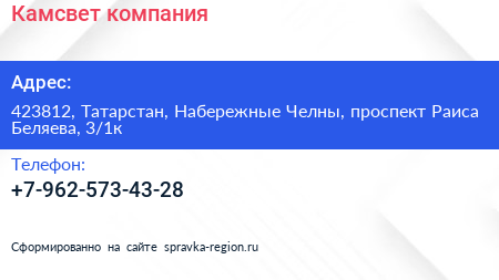 Камсвет, компания по адресу 423812, Татарстан, Набережные Челны, проспект Раиса Беляева, 3/1к в дальнейшем Организация, размещена в следующих категориях: