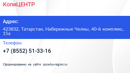 КопиЦЕНТР по адресу 423832, Татарстан, Набережные Челны, 40-й комплекс, 15а в дальнейшем Организация, размещена в следующих категориях: