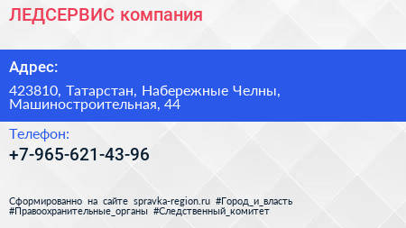 ЛЕДСЕРВИС, компания по адресу 423810, Татарстан, Набережные Челны, Машиностроительная, 44 в дальнейшем Организация, размещена в следующих категориях: