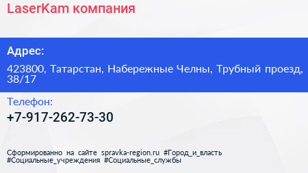 LaserKam, компания по адресу 423800, Татарстан, Набережные Челны, Трубный проезд, 38/17 в дальнейшем Организация, размещена в следующих категориях:
