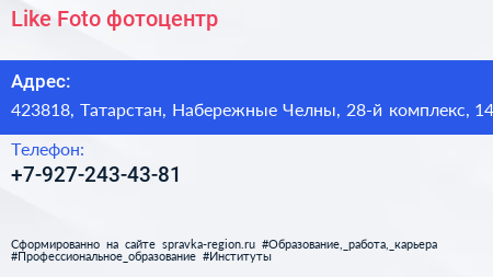 Like Foto, фотоцентр по адресу 423818, Татарстан, Набережные Челны, 28-й комплекс, 14 в дальнейшем Организация, размещена в следующих категориях: