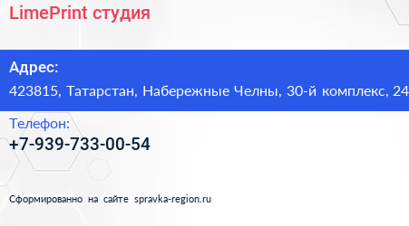 LimePrint, студия по адресу 423815, Татарстан, Набережные Челны, 30-й комплекс, 24 в дальнейшем Организация, размещена в следующих категориях: