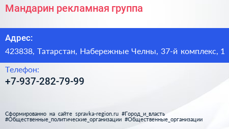 Мандарин, рекламная группа по адресу 423838, Татарстан, Набережные Челны, 37-й комплекс, 1 в дальнейшем Организация, размещена в следующих категориях: