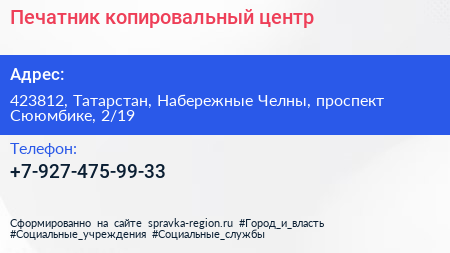 Печатник, копировальный центр по адресу 423812, Татарстан, Набережные Челны, проспект Сююмбике, 2/19 в дальнейшем Организация, размещена в следующих категориях: