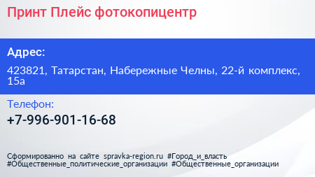 Принт Плейс, фотокопицентр по адресу 423821, Татарстан, Набережные Челны, 22-й комплекс, 15а в дальнейшем Организация, размещена в следующих категориях: