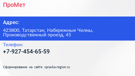 ПроМет по адресу 423800, Татарстан, Набережные Челны, Производственный проезд, 45 в дальнейшем Организация, размещена в следующих категориях: