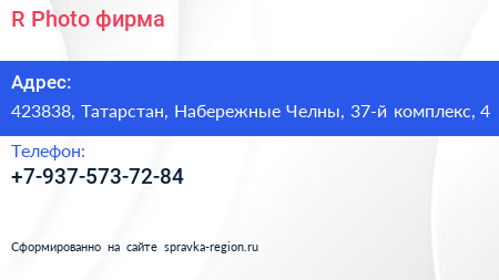 R-Photo, фирма по адресу 423838, Татарстан, Набережные Челны, 37-й комплекс, 4 в дальнейшем Организация, размещена в следующих категориях: