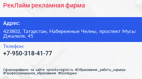 РекЛайм, рекламная фирма по адресу 423802, Татарстан, Набережные Челны, проспект Мусы Джалиля, 45 в дальнейшем Организация, размещена в следующих категориях:
