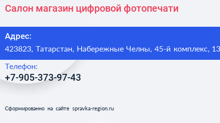 Салон-магазин цифровой фотопечати по адресу 423823, Татарстан, Набережные Челны, 45-й комплекс, 13 в дальнейшем Организация, размещена в следующих категориях: