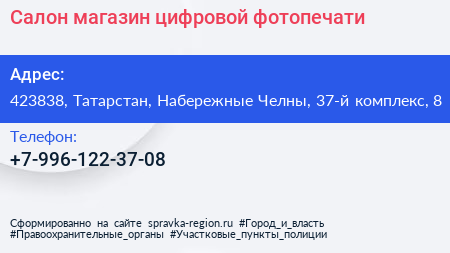 Салон-магазин цифровой фотопечати по адресу 423838, Татарстан, Набережные Челны, 37-й комплекс, 8 в дальнейшем Организация, размещена в следующих категориях: