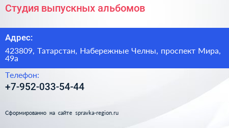 Студия выпускных альбомов по адресу 423809, Татарстан, Набережные Челны, проспект Мира, 49а в дальнейшем Организация, размещена в следующих категориях: